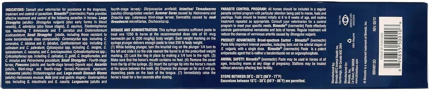 Bimectin(R) 1.87% Ivermectin Apple Flavored Paste Wormer by Bimeda(R) Anthelmintic and boticide that c ontrols large and small strongyles, pinworms, ascarids, hairworms, large mouth stomach worms, lungworms, intestinal threadworms and bots. Features: Great apple flavor 1.87% Ivermectin Proven safe for pregnant mares, breeding stallions and foals Item Specifications: Dosage: Each syringe treats up to a 1250 lb. horse. Syringes are marked in 250 lb. increments. For additional product information, click on the Downloadable Resources to the right.