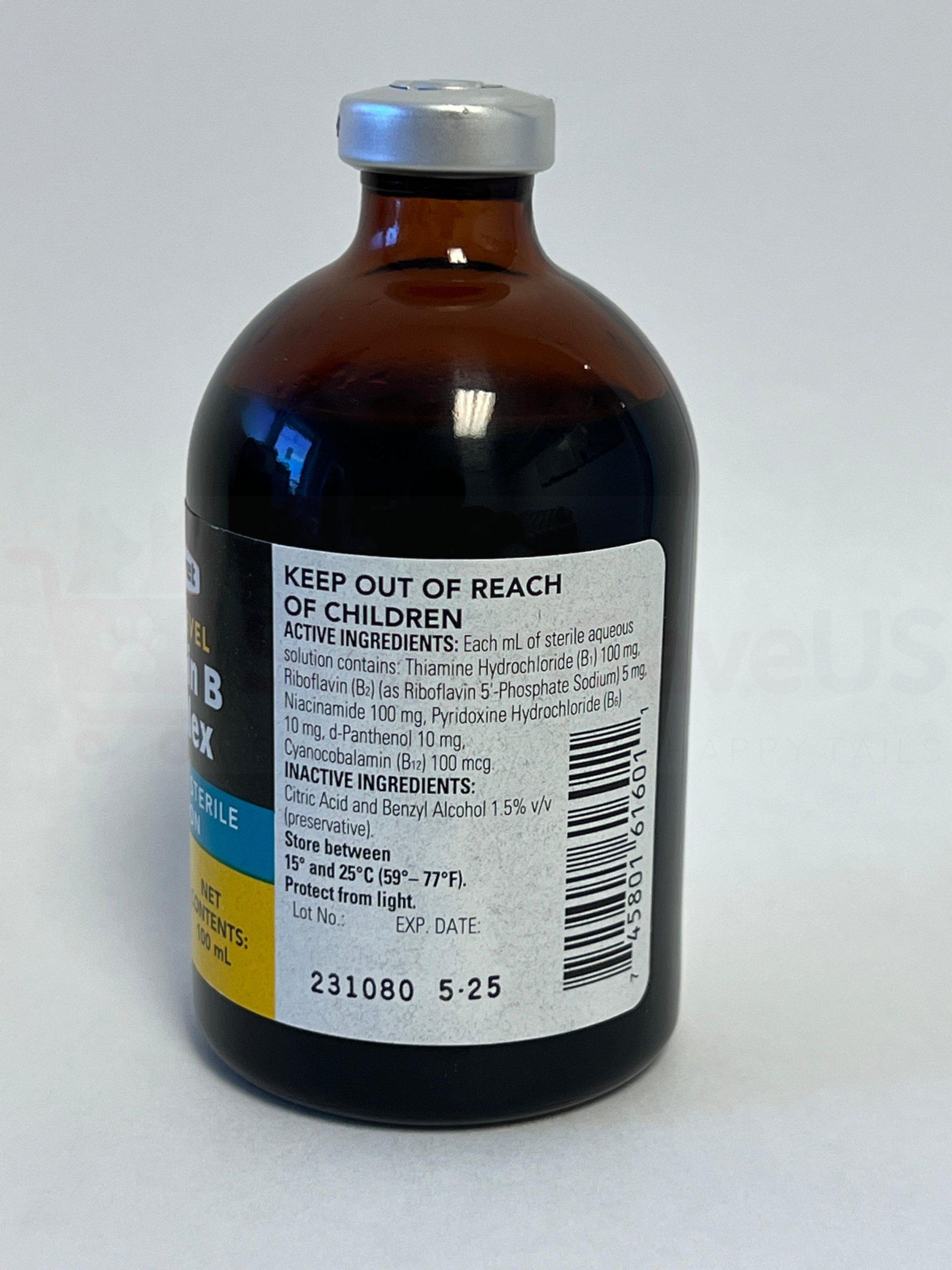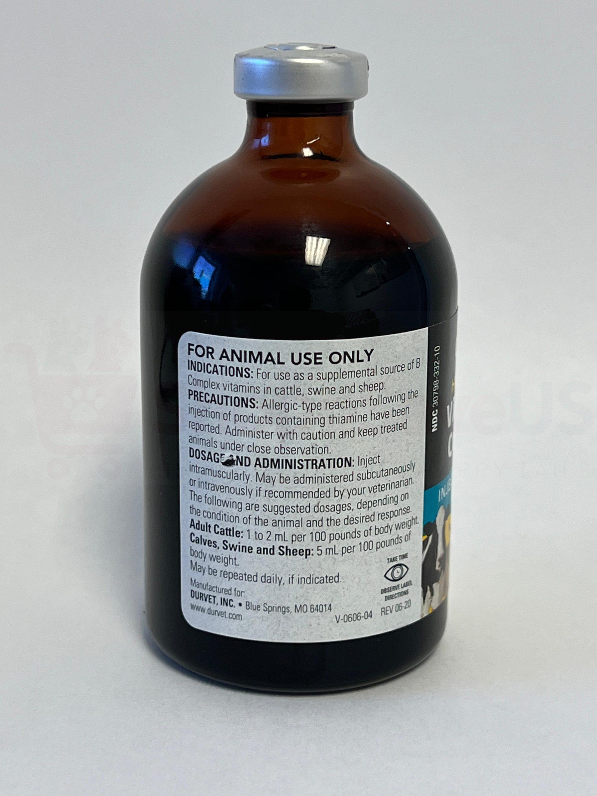Durvet Vitamin B Complex 100ml is a high-potency injectable solution designed to provide supplemental B vitamins to cattle, sheep, and swine. It’s particularly useful for animals experiencing deficiencies due to low protein or mineral-deficient diets, or during periods of stress like shipping or illness. The solution contains a complex of B vitamins and complexed cobalt, and it can be administered intramuscularly, subcutaneously, or intravenously as directed by a veterinarian.