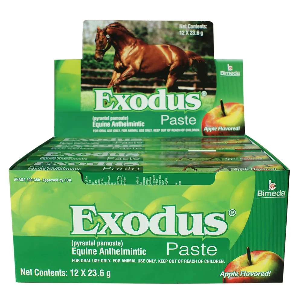 Exodus Pyrantel Paste contains 43.9% w/w pyrantel pamoate and is used in horses and ponies for the removal and control of mature infections caused by large and small strongyles, pinworms, and large roundworms.