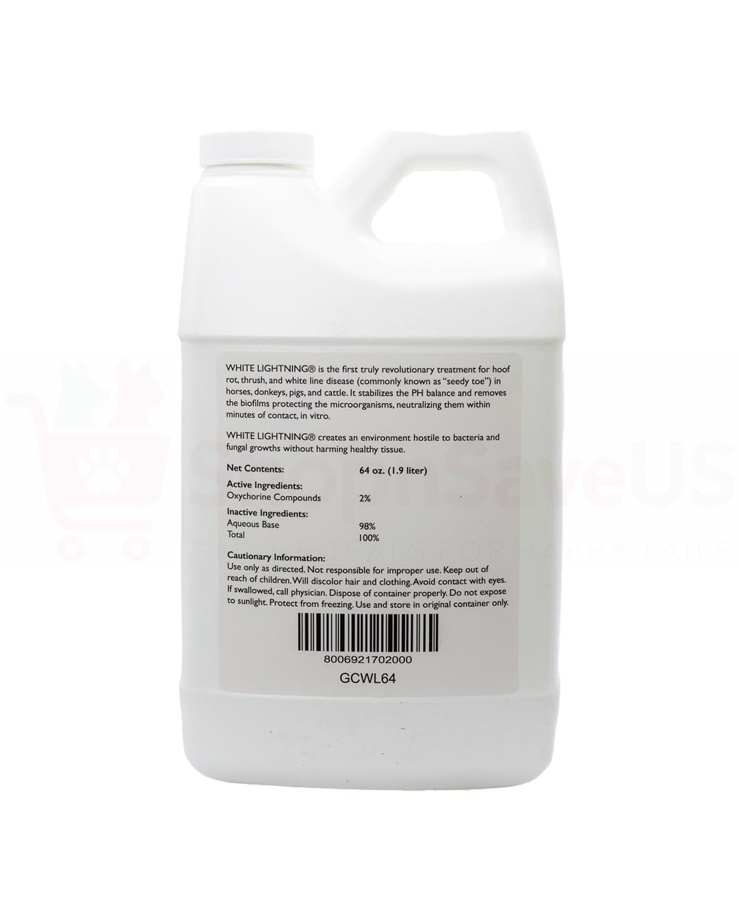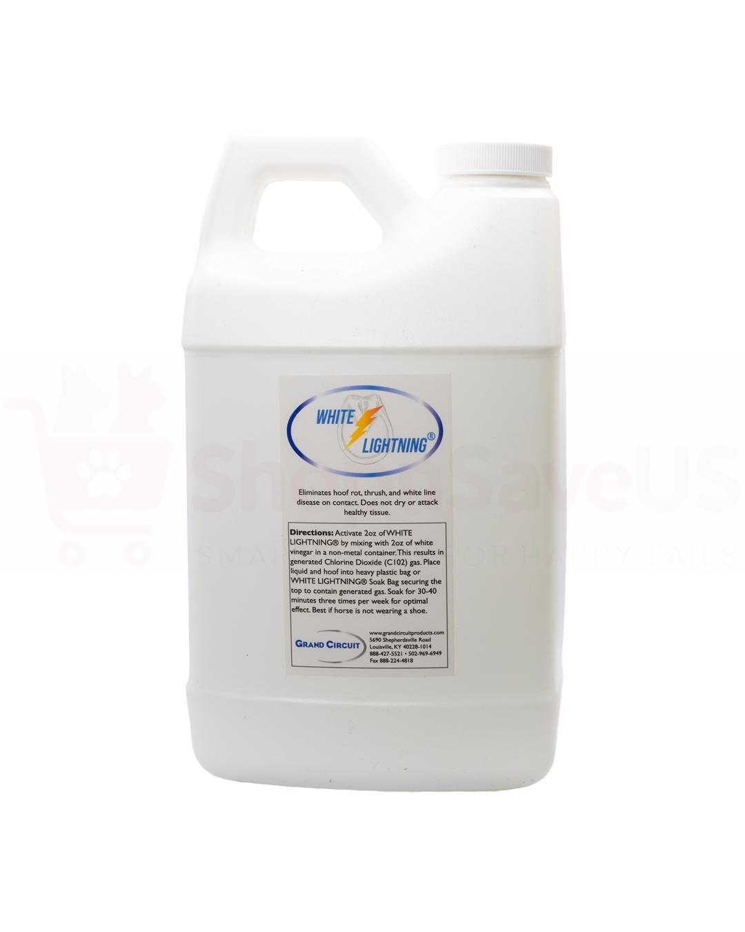 Activate Liquid formula by mixing with equal amounts of white vinegar in a non-metal container; stays active for up to 8 hours. For hoof soak, combine 2 oz White Lightning, 2 oz white vinegar and enough water to cover half way up the hoof capsule. Insert hoof in Disposable Soak Bag (sold separately) or heavy plastic bag to contain the chlorine dioxide gas and secure top to prevent leakage. For best results, keep hoof contained for 40-45 minutes. Repeat 2-3 times per week for 4-6 weeks, then 1-2 times weekly until hoof has grown out completely.