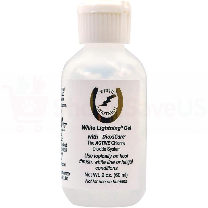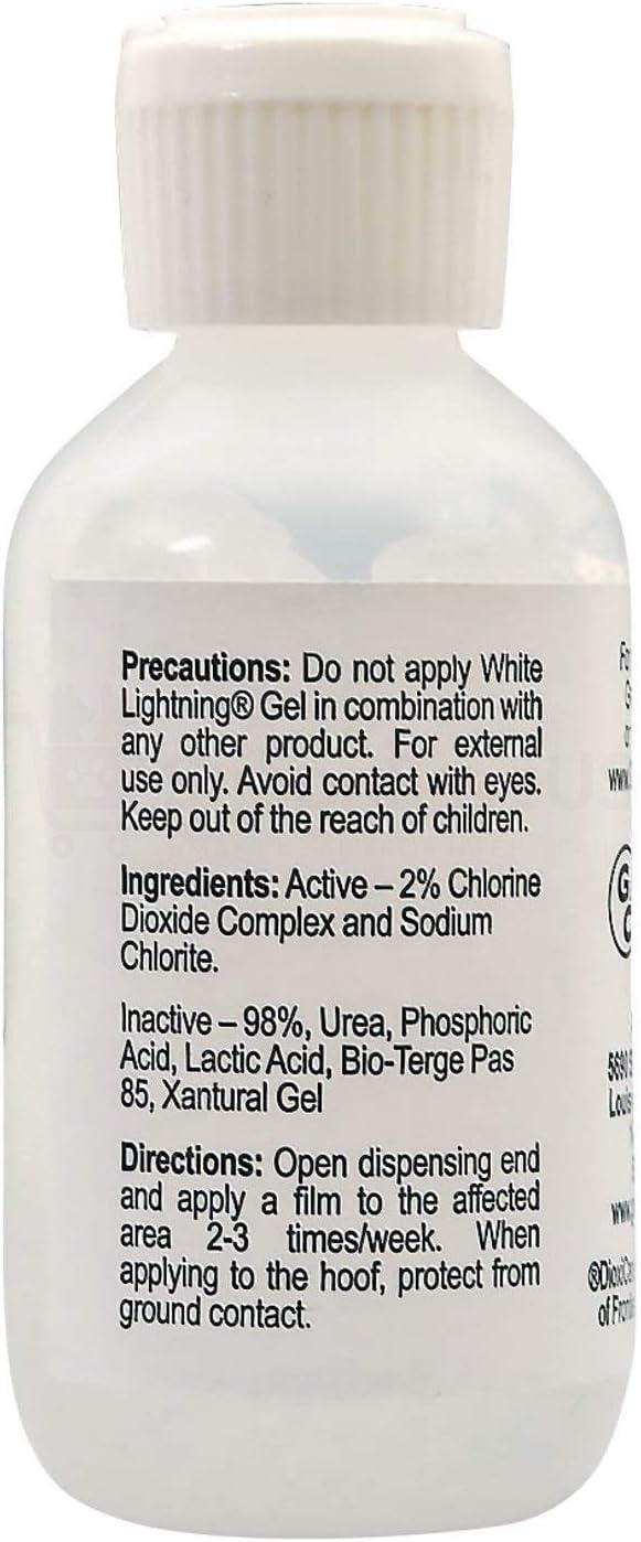 White Lightning is the active Chlorine Dioxide (ClO2) solution to Thrush, Skin Fungus and White Line Disease. Chlorine Dioxide has been demonstrated to be bactericidal, fungicidal, virucidal and sporicidal while remaining harmless to healthy tissue. White Lightning is safe to use, and unlike hypochlorite, does not produce toxic byproducts. Chlorine Dioxide is so safe, it is routinely added to orange juice and other consumer foods and beverages to kill contaminants and prevent spoilage. Chlorine Dioxide is even used by dentists in periodontal work. Not only is ClO2 safe, but it is up to seven times more effective than chlorine bleach. Chlorine Dioxide is an unstable gas…meaning it cannot be stored in a container, but rather must be generated when needed. This is accomplished by adding equal amounts of White Lightning to a mild acid such as white vinegar. A chemical reaction then occurs generating ClO2. After a period of time, all gas is released and the resulting liquid is inert and totally harmless. In the case of the White Lightning Gel, the same reaction occurs. The Gel is easier to use and is the better choice in certain applications.
