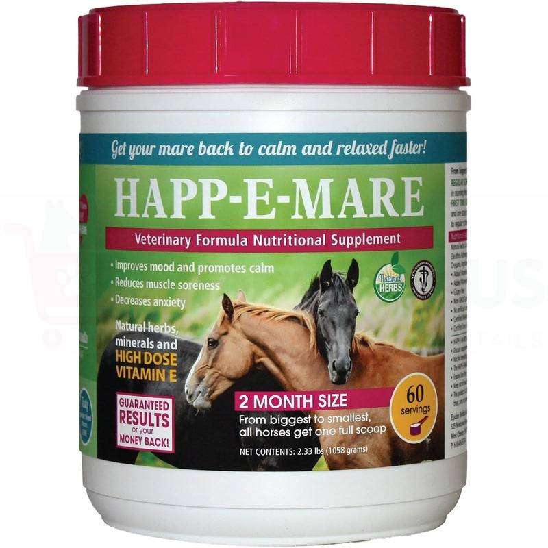 Happ-E-Mare Equine Supplement by Equine Medical and Surgical Associates Is your mare anxious, upset or stressed? Is she showing signs of sore muscles, loss of focus, colic-like symptoms and can’t settle down? Difficult to ride? Always in heat? Just plain irritable? Happ-E-Mare can help get your mare back to calm and relaxed faster. Developed by Dr. Frank Reilly, DVM, it is an all-natural blend of nine balancing herbs, plus multiple vitamins including high-dose Vitamin E, along with natural minerals, to help keep a mare calm and relaxed, move better with no muscle soreness, stop moodiness, get back to riding in comfort, and improve movement and quality of life. Features: Gets mares back to calm and relaxed faster Improves mood, reduces muscle soreness, and decreases anxiety Also good for nervous or anxious geldings and stallions Quick-acting, with results in 14 days Can be used while showing and racing Gluten-free Non-GMO/Certified herbicide-free (includes glyphosate) No artificial colors Certified melamine-, pesticide-, lead- and drug-free Low in sugar, starch and fructan Two-month supply — from biggest to smallest, all horses get one full scoop 25cc scoop enclosed Item Specifications: Size: 60 servings Ingredients: Each dose contains natural herbs in a great-tasting proprietary blend of eleuthro, ashwaganha, raspberry leaf, chastetree berry, ginger, oregano, arginine, spirulina, MSM, boswellia and chia; Vitamins E and B6, and Magnesium oxide. Directions for Use: Regular schedule: Mix 1 scoop once daily in morning feed. First time users: Mix 1 scoop in morning feed and 1 scoop in evening feed for 14 days in a row, then switch to regular schedule. Note: For equine use only. Not for breeding, pregnant or nursing mares. For additional product information, please see clickable links listed under Downloadable Resources.