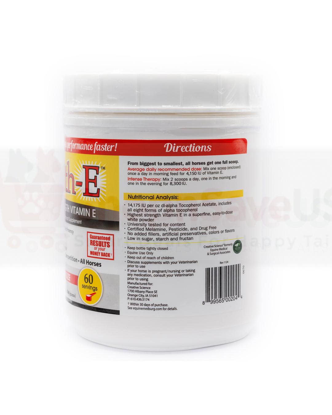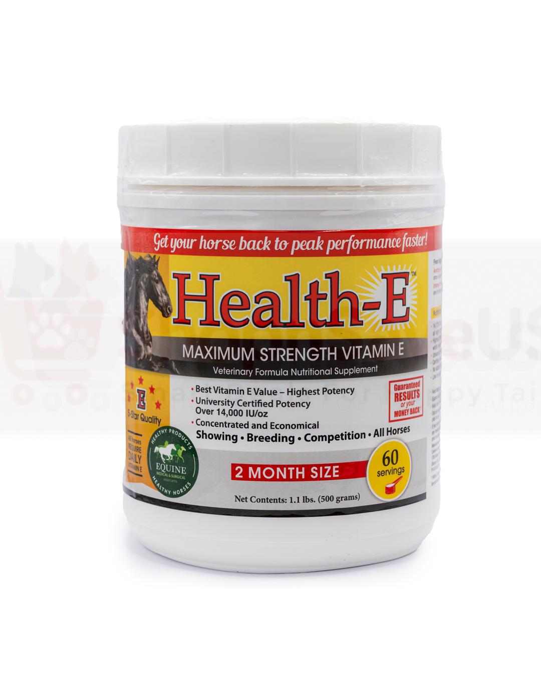 Health-E Maximum Strength Vitamin E by Equine Medical and Surgical Associates Developed by Dr. Frank Reilly, DVM, Health-E is a high-level vitamin E supplement for senior horses and horses with neurological issues to help get them back to peak performance faster. Its concentrated formula is made from soybean oil, is easy to dose, and provides all eight forms of pure vitamin E with a high potency in an economical powder form. Features: Helps provide maximum beneficial support to the immune system, liver, skin, and hair Helps with Neurological issues (Shivers, PSSM, EPM, EDM, motor neuron) as well as muscle soreness, tie-up, and polysaccharide storage problems Good for the senior horse with poor immunity Assists with liver problems, eye disorders, and dull, dry, damaged skin and coat Helps build immunity to disease Encourages a shiny, healthy hair coat Ideal for all horses, especially showing, breeding and competition horses Manufacturer’s Money Back Guarantee Item Specifications: Size: 1.32 lb. (60-day supply at maintenance level) Ingredients: Contains 16,431 IU dl-alpha tocopherol (vitamin E) per oz. Low in sugar, starch and fructan. Contains no fillers, artificial preservatives, flavors, colors or selenium (no need to worry about selenium overdose). University-tested for content; certified melamine-, pesticide- and drug-free. Directions for Use: From biggest to smallest, all horses get the same amount. Scoop enclosed. Maintenance: 1 scoop (1 Tbsp) daily mixed with feed in the morning. Intense therapy: 2 scoops daily, 1 each in the morning and evening.