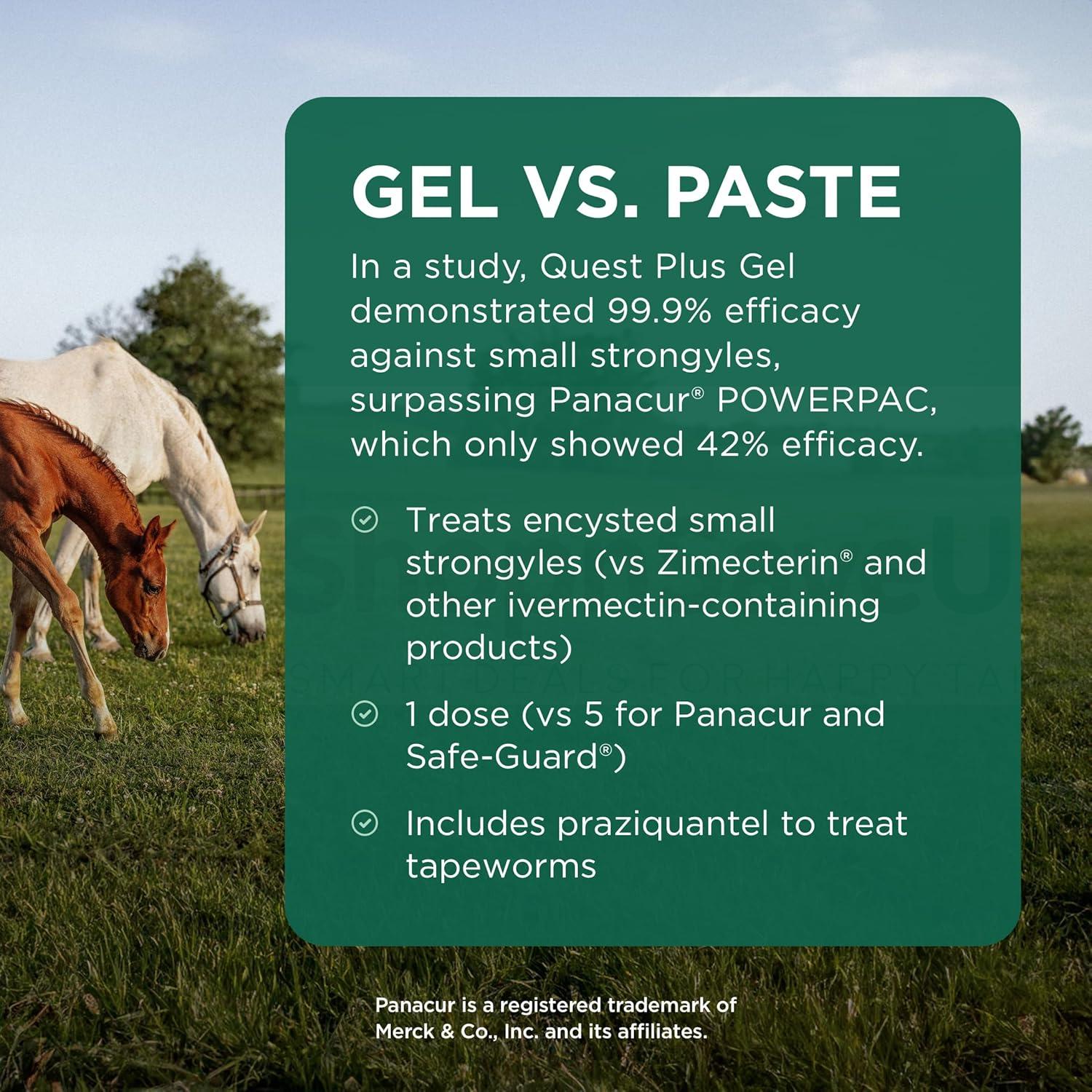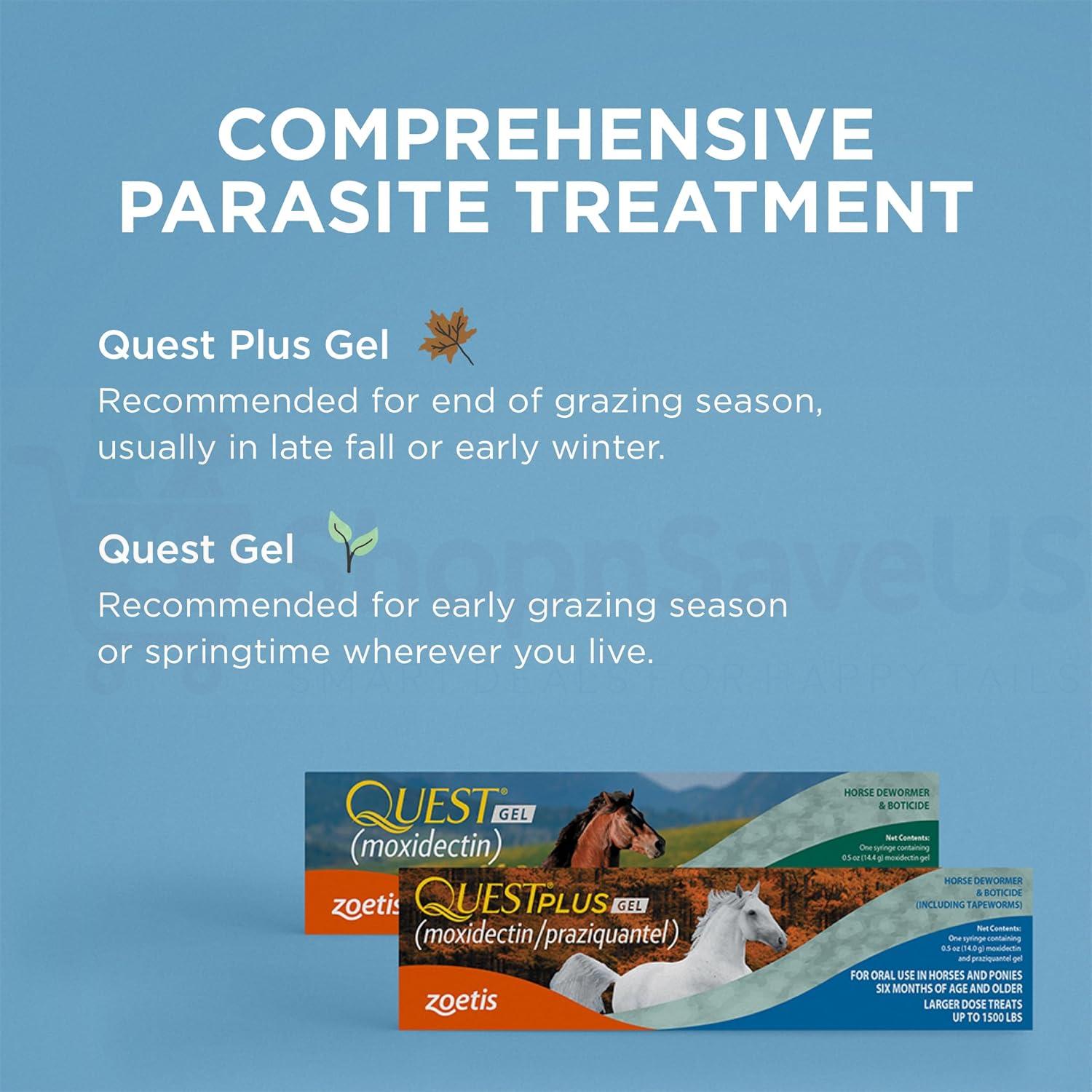 Quest Plus Gel is a broad-spectrum dewormer targeted to treat encysted small strongyle larvae and bots, large strongyles, roundworms, pinworms, hairworms, stomach worms, and tapeworms. Recommended for late grazing season use, the active ingredients moxidectin and praziquantel are a treatment of choice according to the American Association of Equine Practitioners.