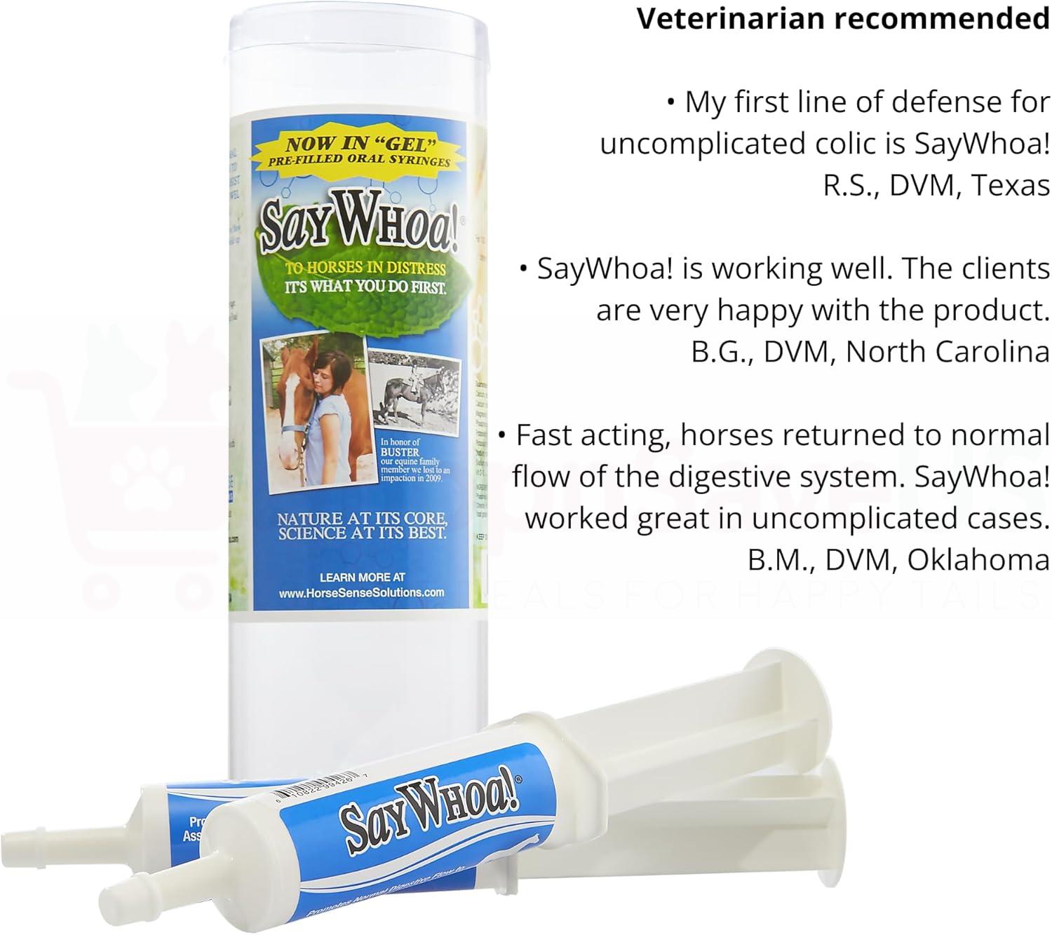 SayWhoa! is a Revolutionary Product. Horses may become dehydrated and impacted by simple acts of severe weather changes, an abrupt change of feed or long horseback rides. SayWhoa! promotes the normal flow of digestion. It’s What You Do First! Packaged in two Pre-Filled Syringes – Two Syringes per horse. You would give both Syringes to a horse or foal over 100 lbs.
